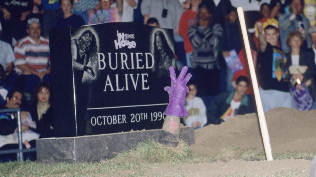 Le Buried Alive (Enterré Vivant) est une stipulation macabre, indissociable de l’Undertaker. Le ring est placé à proximité d’une fosse remplie de terre. Pour l’emporter, un catcheur doit non seulement dominer son adversaire, mais surtout le traîner jusqu’à cette fosse et le recouvrir entièrement de terre pour valider sa victoire. C’est l’un des rares combats où la mise en scène flirte avec le fantastique.